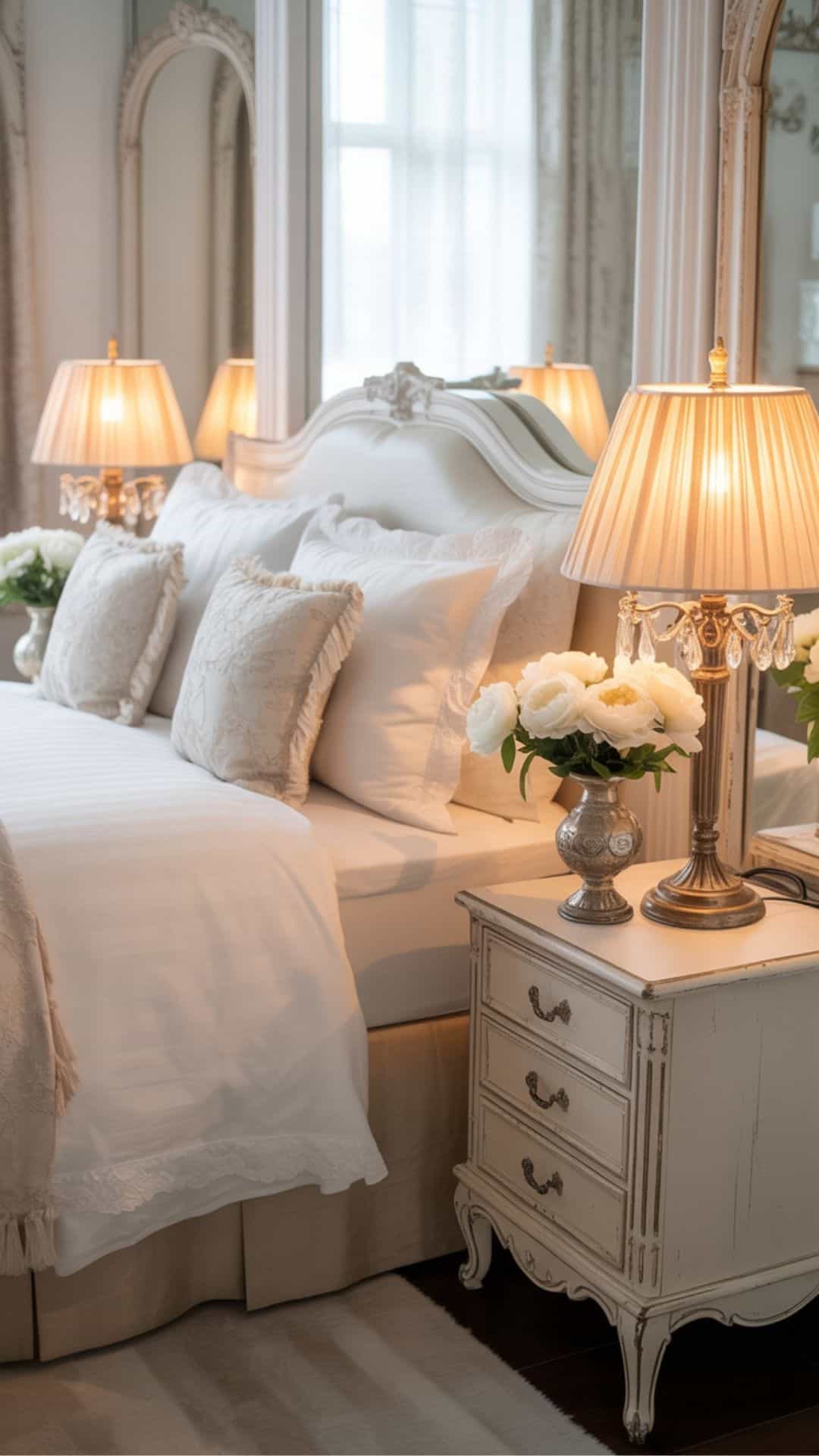 This one is for the shabby chic lover who also dreams of a Paris boutique hotel suite. Everything is just so matching nightstands, layered bedding, fresh blooms, and soft symmetry that makes the space feel polished but still deeply romantic.